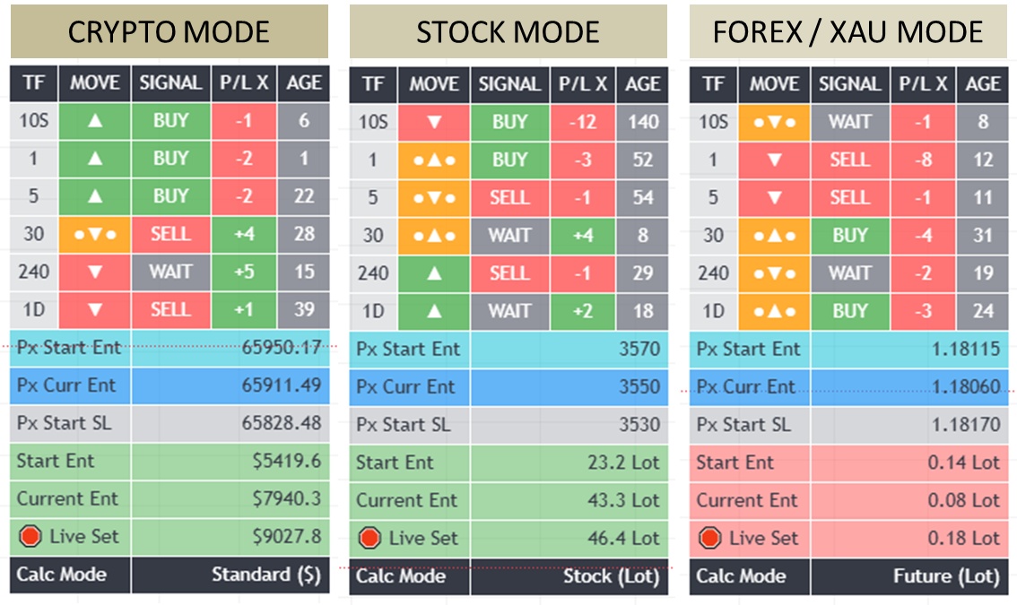 - 📊 Live P/L Tracker: Tahu persis sinyal di timeframe mana yang sedang berjalan profit atau loss, serta rekam jejak (streak) pergerakan harga dari sinyal terakhir, memudahkan pemilihan timeframe yg harus diikuti.
